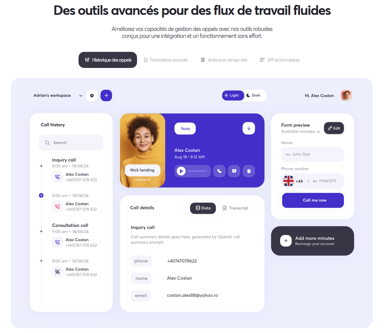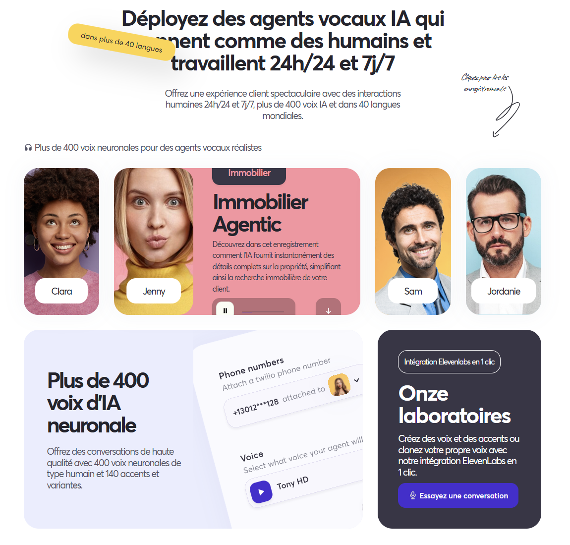CallFluent est une plateforme d’intelligence artificielle spécialisée dans la création d’agents vocaux capables de gérer des appels téléphoniques entrants et sortants, 24h/24 et 7j/7. Ces agents, dotés de voix humaines ultra-réalistes, peuvent être configurés en quelques minutes pour automatiser des tâches telles que la prospection commerciale, la prise de rendez-vous, le support client, les rappels ou encore la réalisation d’enquêtes téléphoniques. L’objectif : permettre aux entreprises et agences de disposer d’un “employé IA” qui ne dort jamais et qui assure une expérience client constante et professionnelle.